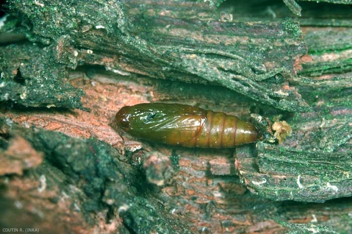 La chrysalide est dans un cocon soyeux à l'intérieur de la grappe, dans les replis des feuilles sèches, sous les écorces ou les liens de paille ainsi que dans les fissures des piquets ou sous les mottes de terre (figure 3).