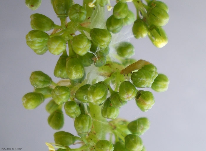 Les dégâts peuvent être importants : les chenilles rongent les grains presque mûrs et diverses moisissures, en particulier Botrytis cinerea, se développent très rapidement sur les blessures ; les grains attaqués brunissent à l'endroit lésé et pourrissent (figure 3). La présence de larves et de grains pourris déprécie la qualité du raisin de table ; les moisissures rendent la vinification difficile et on peut être amené à vendanger précocement.