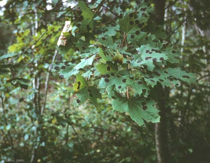 Rhytisma acerinum est le champignon responsable de la maladie des croûtes noires sur la plupart des variétés d'érable, que ce soit en condition de pépinières, forestière ou urbaine. Cette maladie est présente dans la plupart des pays de l'hémisphère Nord.