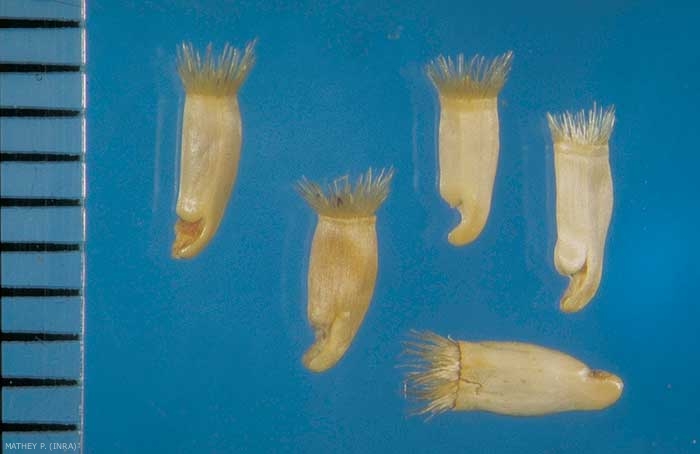 Forme : fusiforme à cylindrique aplati, à base arrondie avec ombilic hilaire rejeté latéralement et sommet tronqué portant l'aigrette. Aigrette à soies persistantes blondes, raides, non pubescentes, égales au 1/3 de la longueur de l'akène