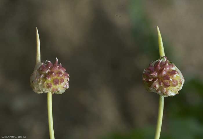 Fleurs peu nombreuses, roses pâles ou blanchâtres, avec de nombreux bulbilles. Pédicelle renflé dans la partie supérieure. Périanthe en cloche avec étamines saillantes, pétales et sépales allongés