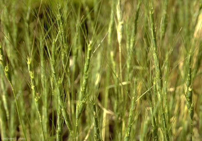 Inflorescence : épi de 4 à 6 cm de long comprenant 4 à 7 épillets (figure 3). Chaque épillet comprend 3 à 4 fleurs vertes, pâles et un peu glauques. Glumes oblongues non ventrues avec 2 à 3 arêtes. La déhiscence se produit au noeud de l'épillet fertile basal (figure 4).