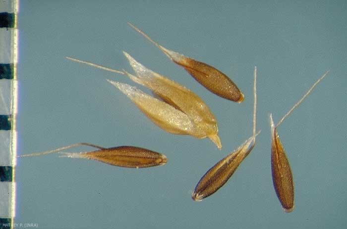Lemme inférieure à 2 mm échancrée à l'extrémité en 2 pointes fines et portant une arête basale courbée. Bords de la lemme entourés vers l'intérieur ; touffe de poils à la base