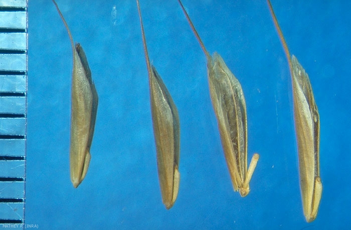 Fruits libérant un caryopse enveloppé de glumelles et déhiscents avec la baguette.