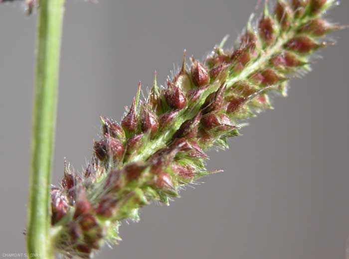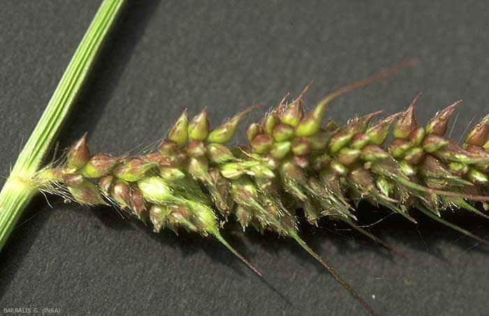 Lemme de la fleur fertile coriace et luisante enveloppant entièrement le caryopse, celle de la fleur stérile aiguë avec une arête de 1 à 2 mm scabre. Présence de poils épineux.