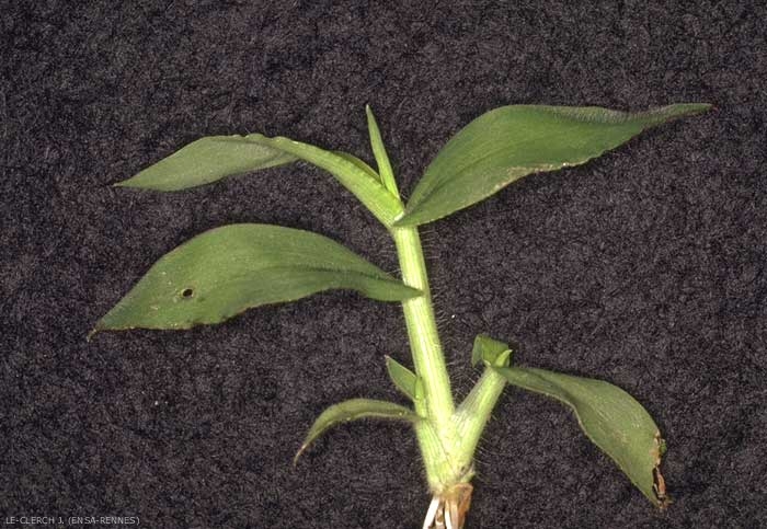 Feuilles d'aspect étroit et long. Cils longs et denses sur les noeuds. Feuilles poilues sur les 2 faces, ciliées à la base, de 15 mm de largeur et 20 à 25 cm de longueur. Nervure médiane, blanchâtre, discrète. Pilosité longue et abondante. Gaine poilue à section arrondie, fréquemment maculée ou veinée de teinte rose ;