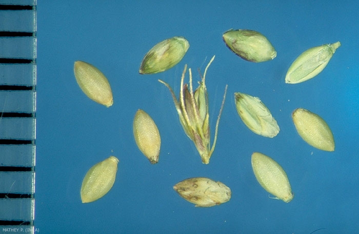 Semence généralement constituée d'un épillet contenant une fleur fertile et une fleur stérile ;