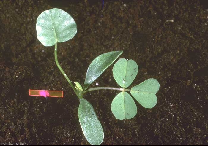 Feuilles vraies rappelant celles du trèfle, avec pétiole long et mince, simple, arrondie. Folioles dentées environ dans leur moitié supérieure, présentant parfois une tache brune ou noirâtre vers leur base. Stipules découpées en lanières aiguës ;