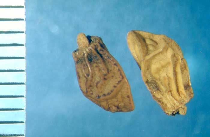Forme : ovoïde allongé, anguleuse, dissymétrique, à base aplanie, une face convexe, l'autre diédrique. Hile hypertrophié à l'intérieur d'un bourrelet à contour arrondi