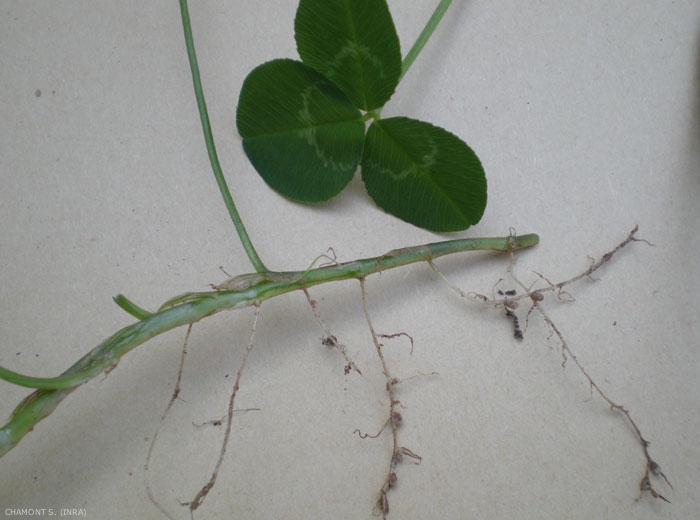 Feuilles aux pétioles plus longs que les folioles ; folioles aussi larges que longues, en forme de coeur, denticulées, à nervures peu saillantes sur la face inférieure ; stipules blanchâtres, membraneuses et brusquement en pointes au sommet ;