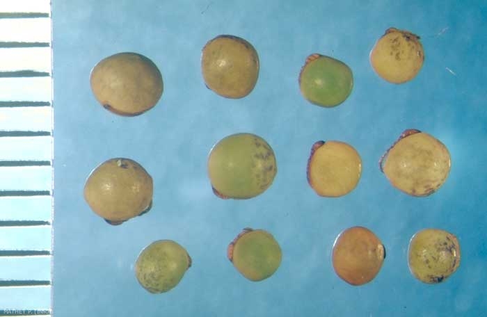 Forme : sphéroïde aplanie, avec hile masqué par un bourrelet plaqué sur un partie du pourtour de la graine, déformant l'aspect général sphérique ;