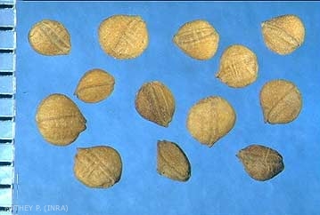 Loge fertile recouverte d'une bosse spongieuse. Fruits légèrement comprimés un peu en forme de lentille et ridés transversalement.