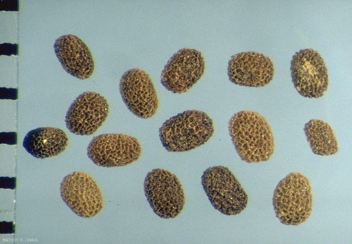 Forme : ovoïde-ellipsoïde, aplanie sur une face, hile ponctiforme