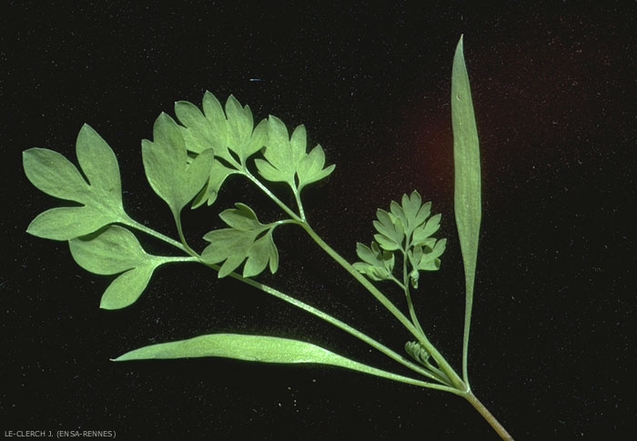Feuilles inférieures disposées en rosette. Feuilles vert-bleuté bipennatiséquées à lobes ovales lancéolés