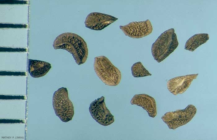 Forme : ovales, à 3 angles aigus, non ailées, anguleuse +/- carénée, légèrement réniforme ;