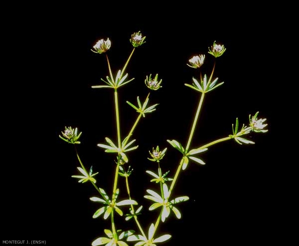 Feuilles inférieures verticillées par 4, les feuilles moyennes et supérieures par 6 à 8, obovales à linéaires, bord et nervure principale rudes par de petites soies crochues, le reste est glabre