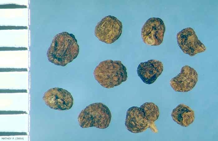Forme : sphérique, globuleuse. Hile souligné par une fossette circulaire