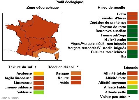 Cette adventice est présente partout en Europe, sauf dans les pays méditerranéens (Portugal, Italie) ou elle est plus rare. Rencontrée dans de nombreuses cultures, cette plante est plus présente en sols argilo-limoneux et limoneux.