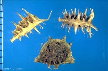 Fruit aplati, ovale, 6 à 7 mm de long, à surface et bords généralement hérissés d'épines arquées. Petit bec arqué ;