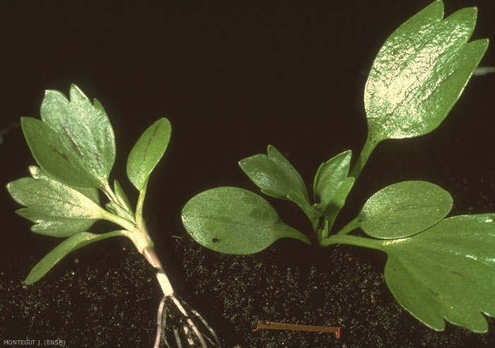 Feuilles inférieures entières, en éventail, triangulaires à ovales, dentées au sommet.