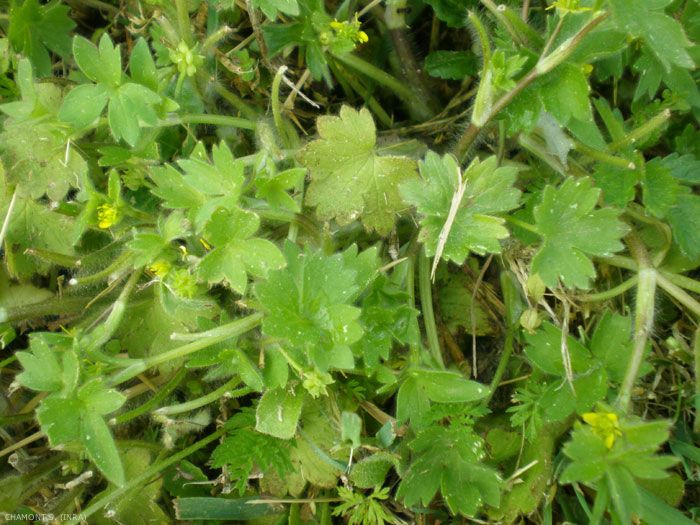Fleurs jaunes, très petites (6 à 8 mm). Sépales renversés. Pédoncules grêles, sans sillons longitudinaux. Carpelles couverts de tubercules terminés chacun par une petite pointe en crochet ;