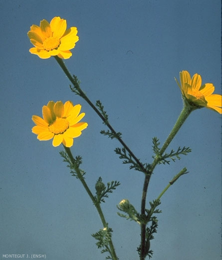 - dénominations européennes : yellow anacyclus (GB), Sonnen-Flügelfruchtkamille (D), manzanilla loca (E), camomilla radiata (I), pao-posto (P)