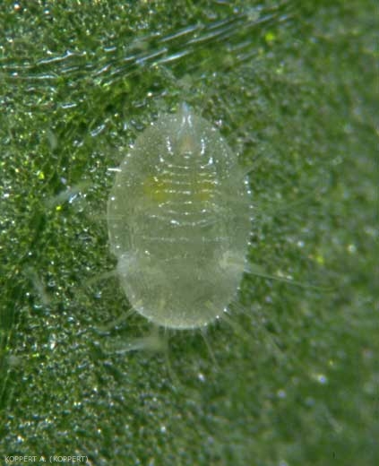Dans les jours qui suivent la ponte, ils deviennent foncés. Entre 7 et 10 jours après, a lieu l'éclosion des larves (figures 2-3)(figures 6 et 7) ; celles-ci, ovales et plates, mesurent 0,3 mm et possèdent des antennes et des pattes bien développées. Perdant ces dernières par la suite, elles sont immobiles et se nourrissent avec leur rostre.