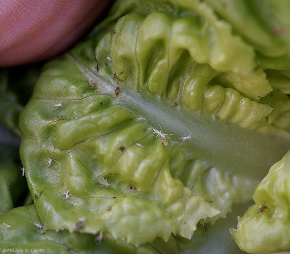 Plusieurs espèces de pucerons* (aphids) peuvent former des colonies sur les jeunes feuilles des salades (figures 1 à 5), ceci dès la pépinière : Myzus persicae (Sulzer 1776) (figure 6), Nasonovia ribisnigri (Mosley)(puceron de la laitue), Aphis gossypii (Glover 1877)(sous serre notamment) (figure 7), Macrosiphum euphorbiae (Thomas 1878) (figure 8), Hyporomyzus lactucae (L.) ...