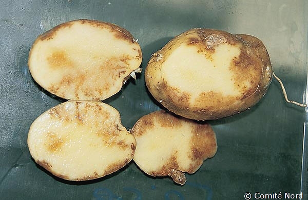 A la coupe de tels tubercules, on observe des zones de chair marbrée de couleur rouille juste sous l’épiderme mais elles peuvent s’étendre vers le centre du tubercule (figure 8).