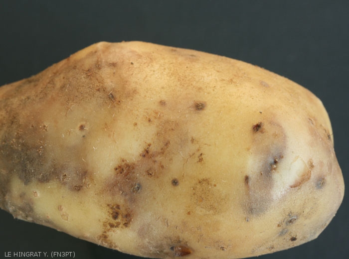 Extérieurement, les tubercules atteints présentent des taches au contour mal défini (marbrures), de couleur brune ou gris-violacé qui peuvent être un peu déprimées (figures 6 et 7).