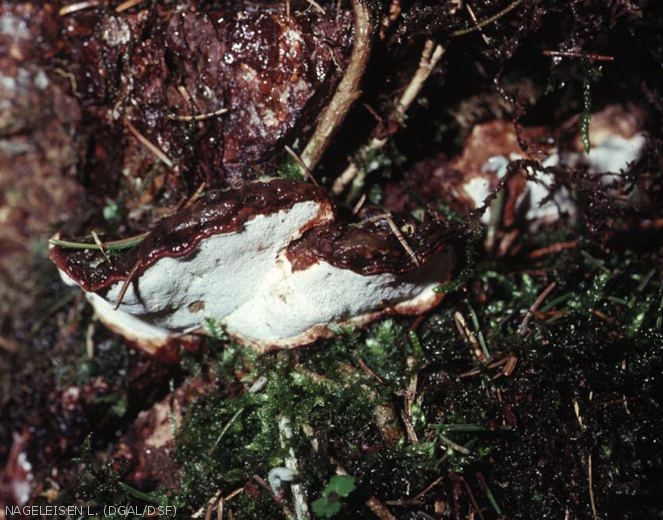 - Présence de carpophores au pied des arbres ou sur des racines latérales (au niveau de la litière), souvent plutôt sur des souches anciennes. Le carpophore est de forme irrégulière, la croûte du dessus étant de couleur acajou, brun chocolat à noire en vieillissant, alors que la surface inférieure porée est de couleur blanche à crème. Sa taille est variable, de quelques centimètres à plusieurs dizaines de centimètres.