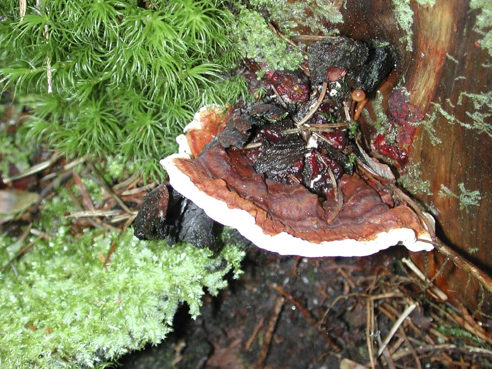- chez les épicéas, le fomes provoque dans un premier temps une coloration du bois du coeur, qui peut remonter depuis le collet jusqu'à plusieurs mètres de hauteur : c’est le « coeur rouge de l’épicéa », qui évolue ensuite vers une pourriture fibreuse blanche, qui est purgé sur coupe, et représente d’importantes pertes économiques ; très généralement, la vie de l’arbre n’est cependant pas compromise et aucun symptôme extérieur n'est visible.