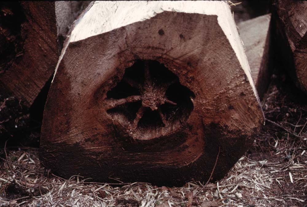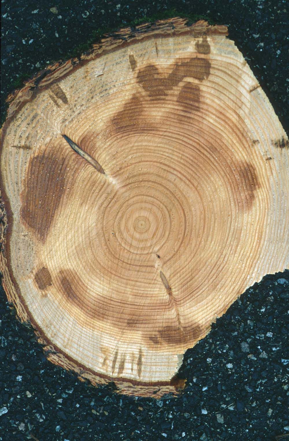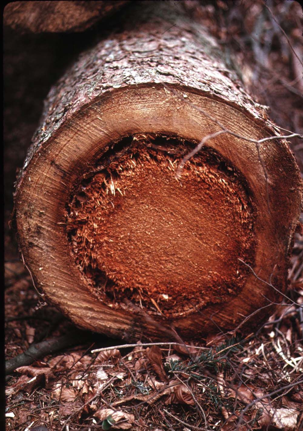 - chez le douglas, les cas de mortalités disséminées ou groupées sont souvent liés à un affaiblissement préalable des arbres, et parfois à des impacts de foudre ; chez les douglas adultes, le fomes peut aussi causer des taches d’altération dans le bois au niveau du collet, à la limite du bois de coeur et de l’aubier.
