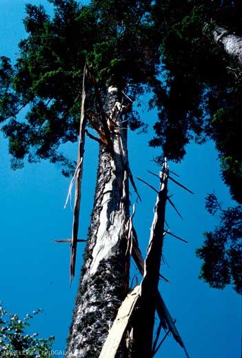 - Fente hélicoïdale sur le tronc, typique de l’arbre foudroyé, explosion du bois, « consumation ».