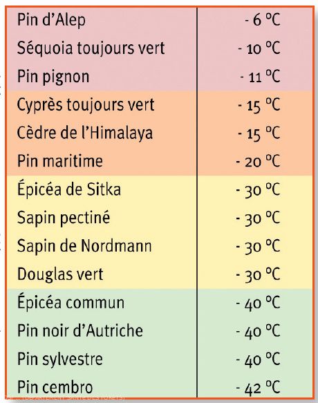 Le froid bloque la feuillaison et la croissance (au-dessous de + 4 à + 7 ° C selon l’essence) et la photosynthèse (au-dessous de - 3 à - 4 ° C). Mais le froid intense peut aussi entraîner la destruction de tout ou partie de l’arbre en provoquant la transformation de l’eau qu’il contient en glace. Les dégâts seront plus ou moins importants selon la sensibilité de l’essence ou de la provenance, le stade de végétation où elle se trouve (les organes en croissance, gorgés d’eau, étant plus sensibles) et la rapidité de la chute