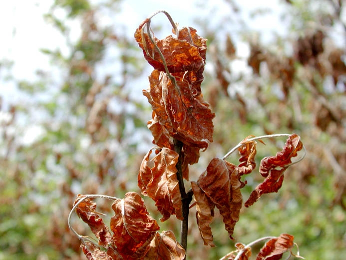 Les gelées tardives au printemps provoquent la destruction des jeunes pousses déjà formées mais non lignifiées. La multiplicité des espèces touchéespar le phénomène révèlent le caractère abiotique de la cause.