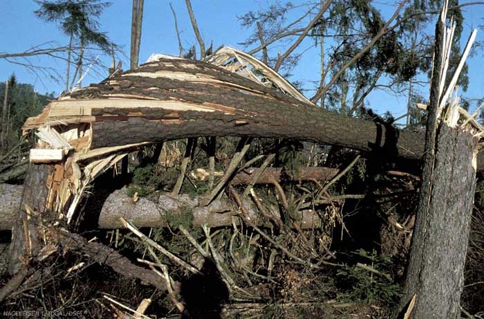 Les tempêtes, ouragans et tornades sont la cause de dégâts variés : arbres penchés, chablis, et bris de cimes, … qui constituent la principale de cause de dommages forestiers actuellement, bien avant les dépérissements ou les dommages biotiques.