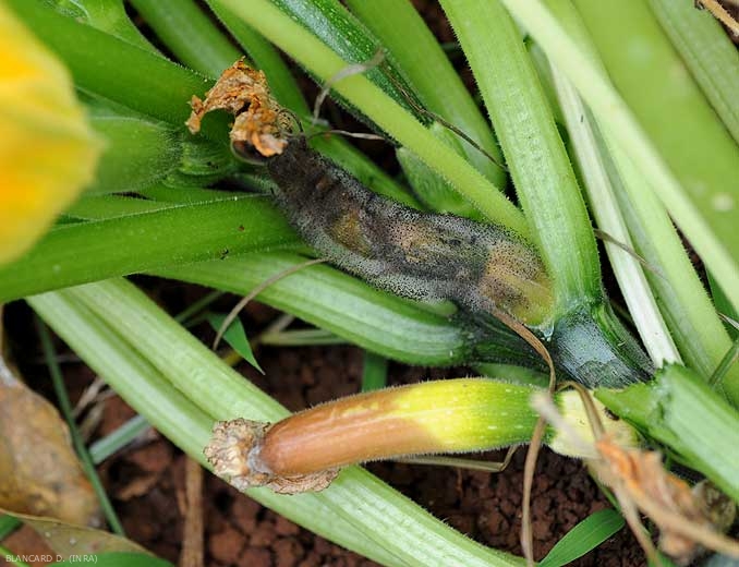 C. cucurbitarum provoque des pourritures sur les fleurs (figure 1) et par la suite sur les fruits (figure 2) des Cucurbitacées. Celles-ci sont souvent humides et située à l'extrémité des fruits. Les tissus affectés, humides et mous, prennent un aspect translucide et une teinte sombre (figures 3 et 4). Les fruits peuvent se liquéfier entièrement en quelques jours.