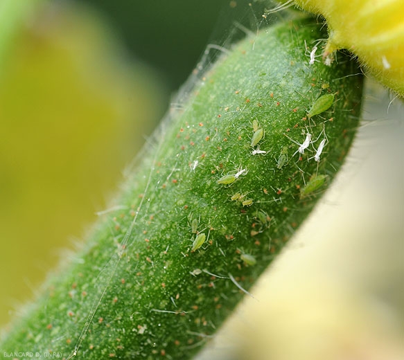 Les pucerons, consécutivement à leurs piqûres nutritionnelles, sont reponsables de ponctuations chlorotiques et de la déformation des jeunes feuilles qui ont tendance à s'enrouler et plus ou moins se boursoufler (figures 1 et 2). Les feuilles, comme les fruits (figures 3 et 4) peuvent être colonisés. Une réduction de la croissance des jeunes pousses, voire des plantes, peut être constatée.