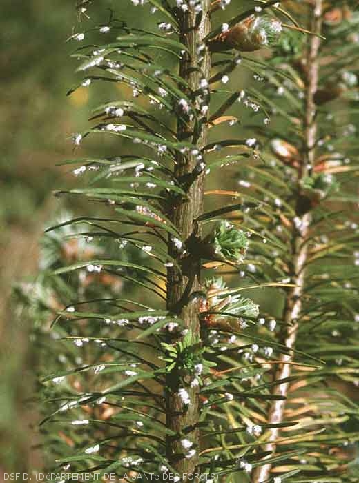 - Douglas : sur aiguilles au début du printemps, larves sous la forme de petits points noirs à la face inférieure des feuilles, puis apparition de petites boules blanches correspondantes aux insectes recouverts de sécrétions cireuses (figures 1 et 2). En été, taches jaunâtres dues aux piqûres et déformations des aiguilles.