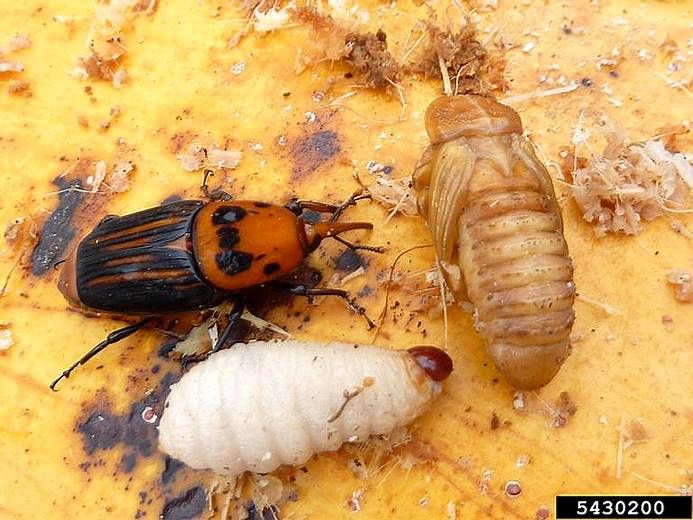 Le cycle de développement complet (figure 1) s’étend sur environ 4 mois et a lieu dans les palmes ou dans le stipe du palmier. Les femelles pondent 200 à 300 œufs à la base des jeunes palmes ou dans des blessures présentes dans les palmes ou sur les troncs. Les œufs éclosent 2 à 5 jours après la ponte, en fonction des conditions climatiques.