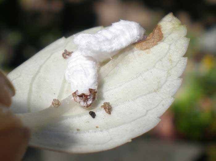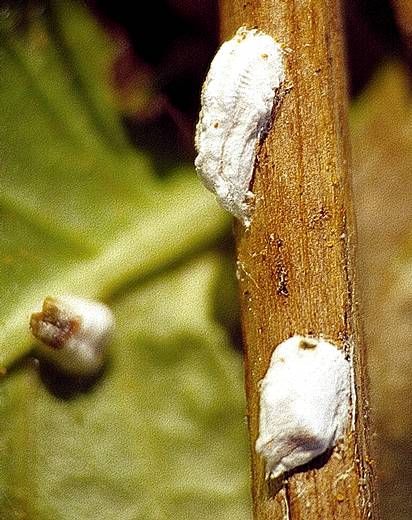 Les insectes mères (ou femelles) sont installés sur la face inférieure des feuilles, leurs ovisacs protégés par des sécrétions cireuses blanches typiques (figure 1). Ces sacs de ponte peuvent atteindre 8 mm de long.