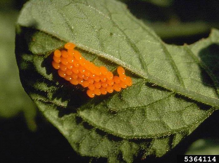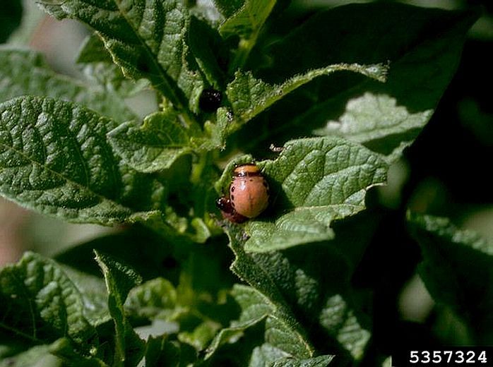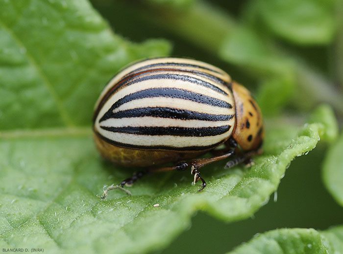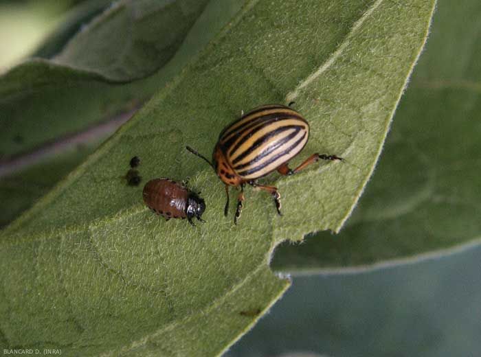 Les insectes et les larves visibles à l’œil nu dévorent les feuilles de pomme de terre. L’insecte adulte (figures 1, 2, 3 et 4) a un corps ovale, très bombé et mesure 10 à 11 mm de long. La tête et le haut du corps sont de coloration brun roux et présentent plusieurs taches noires. Les élytres sont jaunes et ornés de 10 bandes longitudinales noires. Les larves sont rouge orangé (figures 5 et 6) et mesurent 1,5 à 2 mm de long à l’éclosion. Elles atteignent la même taille que les adultes vers la fin de leur développement, en restant rouge plus ou moins foncé. Les œufs (figure 7) sont jaune-orange, longs de 1,5 mm, fixés par paquets de 10 à 30 sur la face inférieure des feuilles.