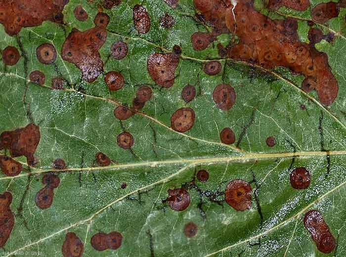 Les pétioles des feuilles sont également attaqués, de même que les jeunes branches, en particulier en conditions fraîches et humides.