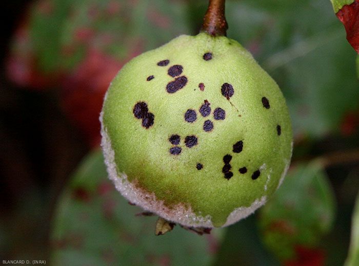 Les fruits sont également affectés, des petites taches crouteuses noires les parsèment (figures 1 et 4)