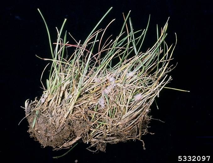 Cette maladie a une répartition diffuse sur toute la surface de la pelouse. Des taches très allongées apparaissent sur les feuilles et fusionnent progressivement. Elles sont blanchâtres à brunes et prennent ensuite une caractéristique couleur rose, puis rouge. Par la suite, les feuilles se décolorent par la pointe et se dessèchent.