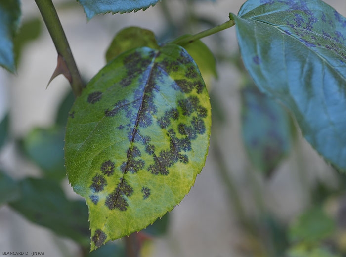 Le champignon produit sur les feuilles de rosier des taches noires plus ou moins circulaires, mesurant de 10 à 15 mm de diamètre (figure 1). Celles-ci en se développant peuvent fusionner pour former de larges plages noires (figure 2). A la périphérie de ces taches, le limbe prend une coloration jaune qui gagne progressivement toute la foliole qui finit par chuter prématurément.