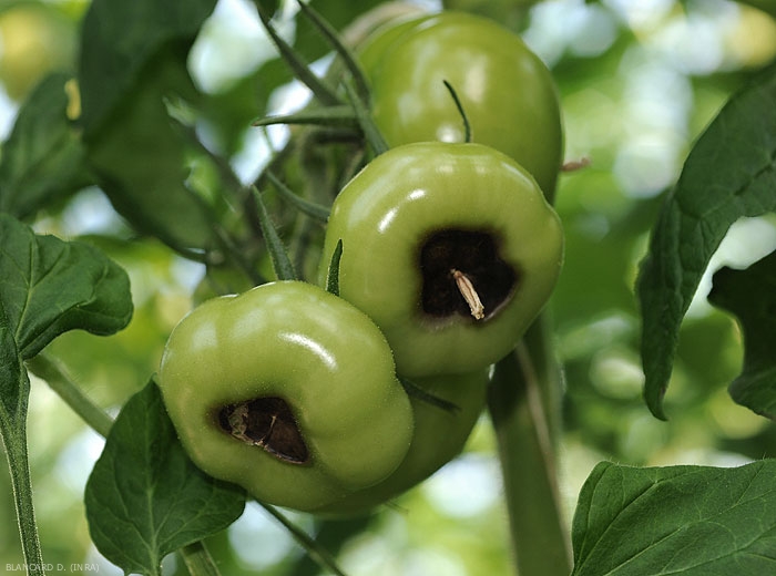 - La nécrose apicale ou « cul noir » (figures 1 à 3), est une maladie non parasitaire (trouble physiologique) affectant essentiellement les fruits de la tomate. Elle est due à une mauvaise assimilation du calcium associées à des apports en eau irréguliers. C’est la cause principale des fruits tachés au jardin. Les symptômes sont très typiques. La lésion est toujours située à l'extrémité du fruit, du côté de la cicatrice florale et donc à l’opposé du pédoncule. C'est une tache en creux diote en « coup de pouce ». Sur fruits verts, elle est d’abord de couleur vert foncé, puis vire au brun au fur et à mesure de la maturation du fruit pour être totalement noire sur les fruits mûrs. Cette maladie physiologique est par ailleurs souvent responsable de la maturité précoce du fruit, avant que celui-ci n’est atteind le calibre normal de la variété.