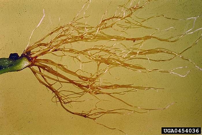 Les racines présentent des zones nécrosées sur toute leur longueur (comparer figures 1 et 2). Ces zones alternent avec des parties saines. Les radicelles sont rares. En coupe, on observe à l’intérieur des racines un cylindre central rouge sang très caractéristique.
