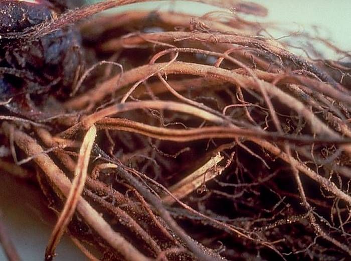 La contamination primaire des racines a lieu à l’automne, les oospores germent et libèrent des zoospores mobiles. Ces derniers se déplacent dans l’eau du sol, vers le haut pour entrer par l’extrémité des jeunes racines. Le champignon investit alors le cylindre central des racines (figures 1 et 2). La température favorable pour la libération des zoospores se situe autour de 15 °C. Le mycélium du champignon croît alors jusqu’à former des hyphes ; sorte d’excroissances perçant les racines pour libérer de nouveaux zoospores dans le sol. C’est ainsi que de nouvelles racines peuvent être infectées.